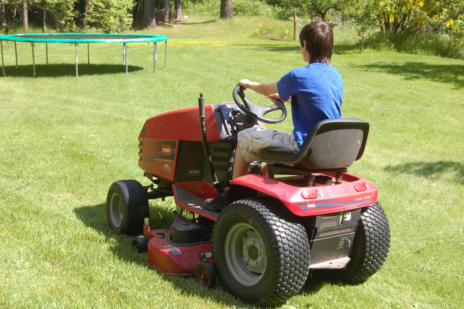 At home, where we have an acre of grass and a little Toro tractor, he does it as a ride-on deal. Fortunately for us he mows willingly and without pay, despite having to drive through the curtains of wee green worms dangling from the fruit trees. I think he mostly likes driving.