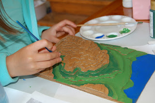 A layer at a time, with bright and darker greens and greys. She used acrylic paint for its forgiving nature and opacity. Of course the open corrugated edges weren't really filled: I wondered about smoothing everything out with some polyfilla. But in the end I didn't suggest that because I figured the real point was to notice the way in which topographic lines on a map, which are so beautifully visible on this model, allow one to approximate the three-dimensional shape of the terrain.