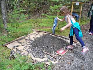 Our shoulders started to get tired from the straps of the denim bags, but we carried on. Everyone was sporting fairly new shoes. Fiona has some little Salomon trail shoes that she hasn't used much yet. Sophie has some new Nikes that were the least rigid, built-up youth running shoe I could find urgently last weekend after we realized she'd outgrown her old runners and was planning to run next week's race and join the school's cross-country team. I was in my recently purchased New Balance WT100's. So it was good to be doing a variety of types of walking, climbing, running and carrying to break in our various footwear. We probably carried our gravel for almost a kilometre.